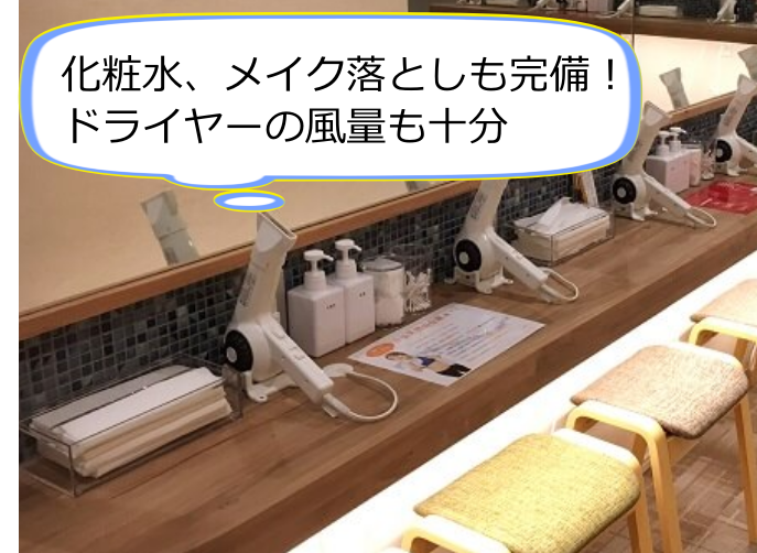 化粧水やメイク落とし、ドライヤーなどが完備されています。